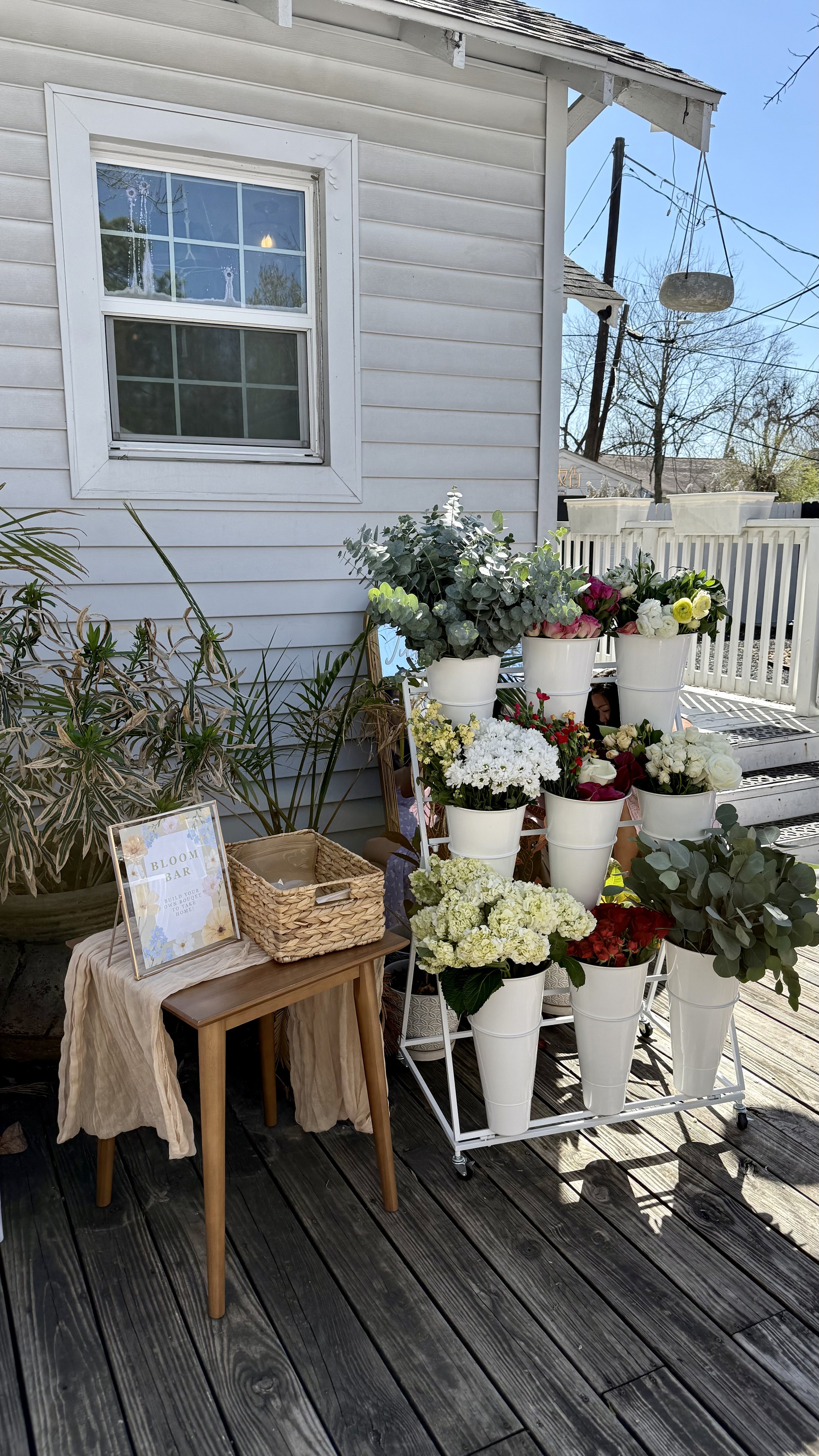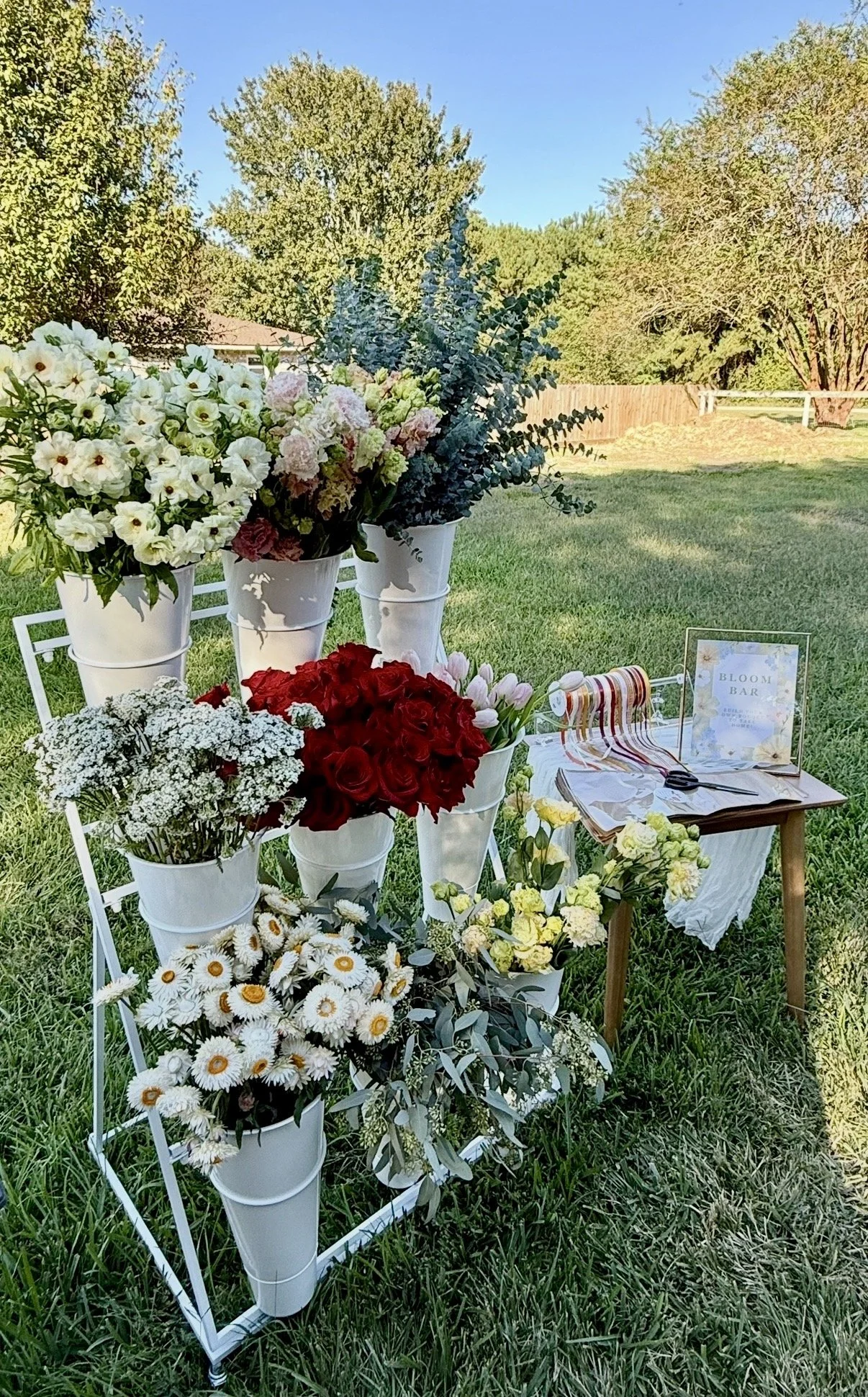 includes 1 white metal Bloom Bar stand (on wheels for easy placement), 9 removable white floral buckets, delivery, setup, and breakdown.